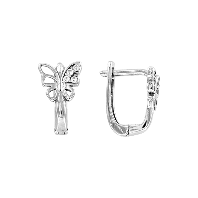 Hübsche Kinderohrringe mit Schmetterlingen aus Sterlingsilber 925, mit Einsätzen aus je 4 Zirkonia, englisches Schloss, Höhe ≈ 14 mm.