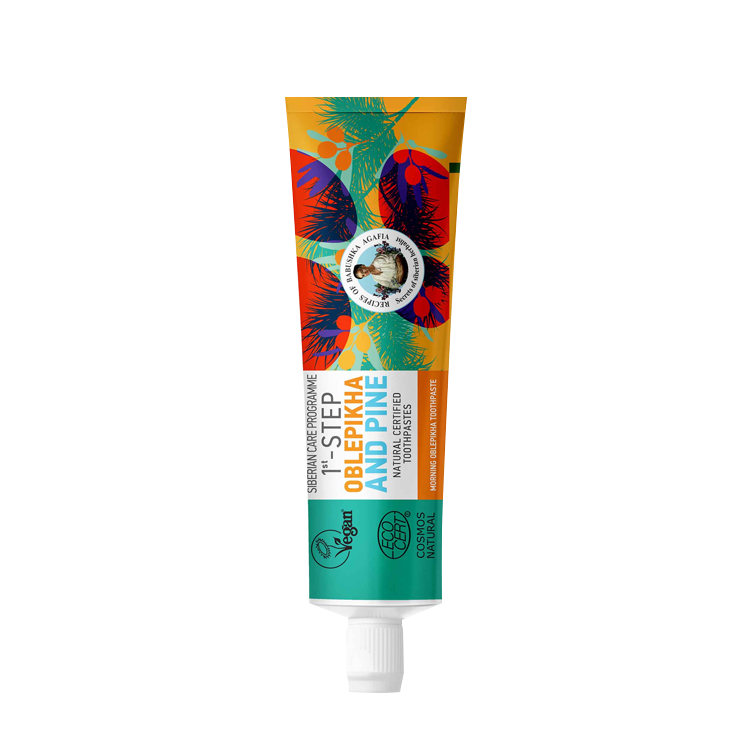 "Rezepte von Oma Agafia"-Set besteht aus 2 natürlichen zertifizierten Zahnpasten Sanddorn und Zirbelkiefer, je 60 g