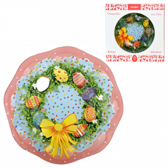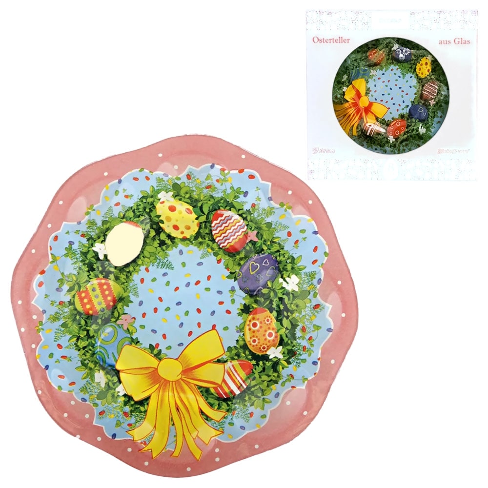 Dieser hochwertige Osterteller aus Glas bietet Platz für 8 Eier und ist die perfekte Ergänzung für deine Osterdekoration. Mit seinen wunderschönen, hellen Farben – einem rosafarbenen Rand, einer hellblauen Mitte mit bunten Punkten sowie bunten Ostereiern und einer großen gelben Schleife – sorgt er für eine fröhliche und festliche Atmosphäre auf deinem Ostertisch.Dank der stilvollen Geschenkverpackung eignet sich dieser Teller auch ideal als Geschenk für Familie und Freunde.
