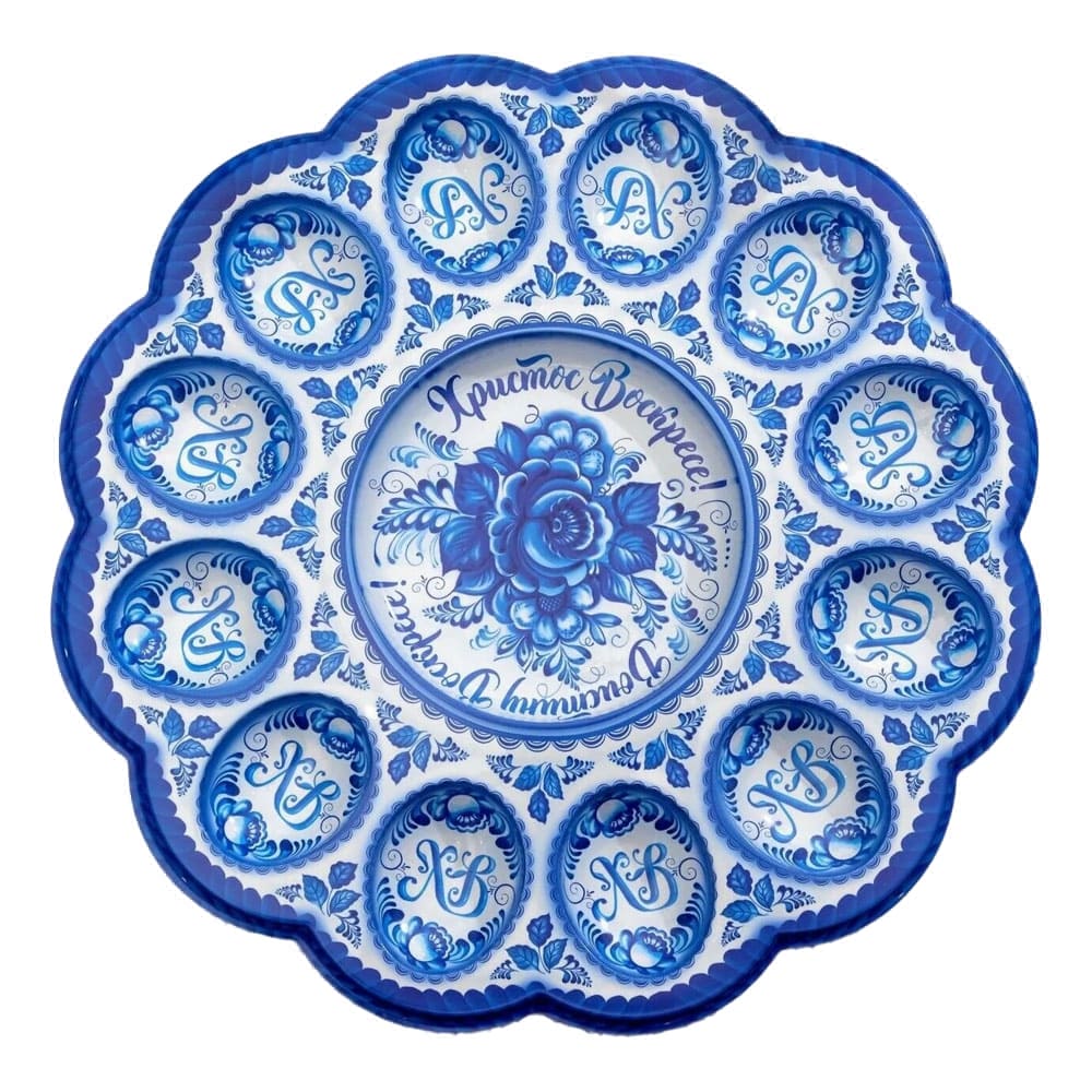 Osterteller Gzhel "Christos Voskres" für 12 Eier und 1 Osterkuchen