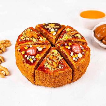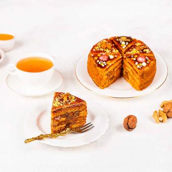 Die Palych Honigbiskuit Fantasie mit Walnuss ist ein wahrer Klassiker unter den Desserts. Diese köstliche Torte vereint luftig-weichen Honigbiskuit mit einer zartcremigen Puddingfüllung auf Basis von gekochter Kondensmilch. Eine Schicht fein gehackter Walnüsse in köstlichem Milchkaramell rundet das Geschmackserlebnis ab und sorgt für eine unvergleichliche Genussmomente. Perfekt für besondere Anlässe oder einfach zum Verwöhnen!Eigenschaften: