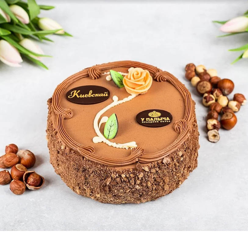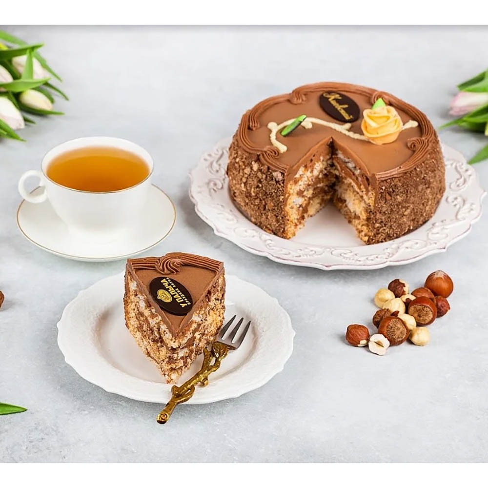 Der Palych Nusskuchen „Kievskiy“ ist eine exquisite, klassische Kuchenspezialität mit ukrainischen Wurzeln. Diese Torte besteht aus drei luftigen Schichten Walnussbiskuit, die aus fein gemahlenen Walnüssen, Eiweiß, Zucker und Mehl hergestellt werden. Die besondere Textur sorgt für ein zart-knuspriges und zugleich leichtes Geschmackserlebnis.Zwischen den Biskuitschichten befindet sich eine cremige, samtige Schokoladenpudding-Füllung, die mit feinem Cognac veredelt wurde. Diese Kombination verleiht der Torte eine harmonische Balance aus nussigen, schokoladigen und leicht herben Aromen.