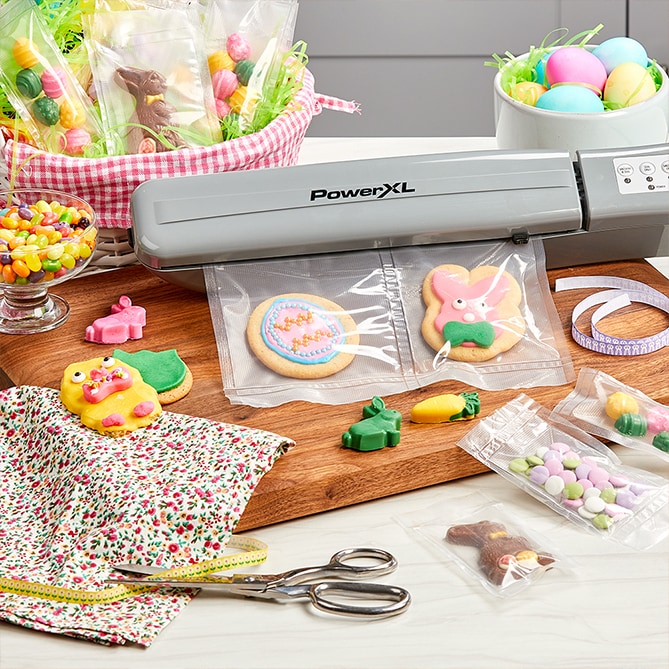 Im Gegensatz zu anderen Geräten hat unser Hand-Vakuumiergerät PowerXL Duo durchgehende Rollen und einen eingebauten Schneider für Beutel in jeder beliebigen Größe.