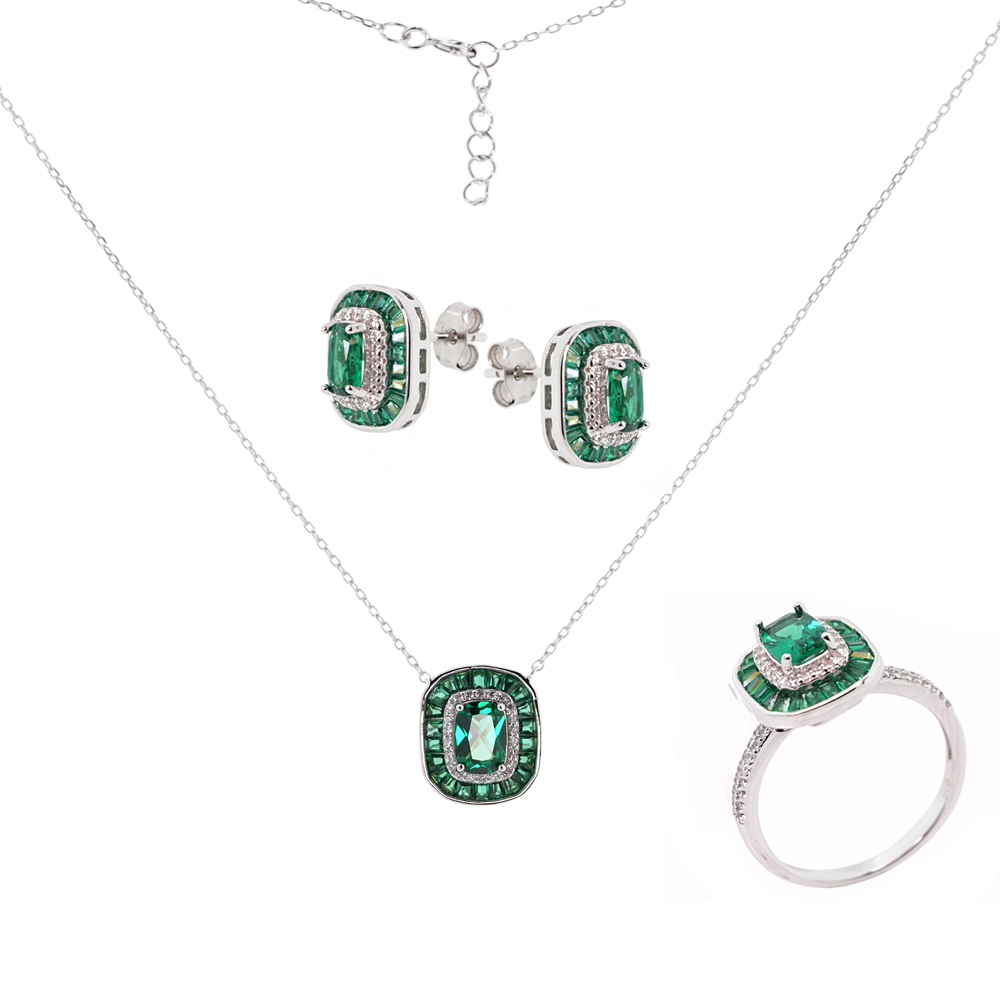 Schmuckset aus 925 Silber mit Zirkonia: Ohrstecker + Halskette mit Anhänger + Damenring - in 4 Farben (blau, grün, weiß, lila)