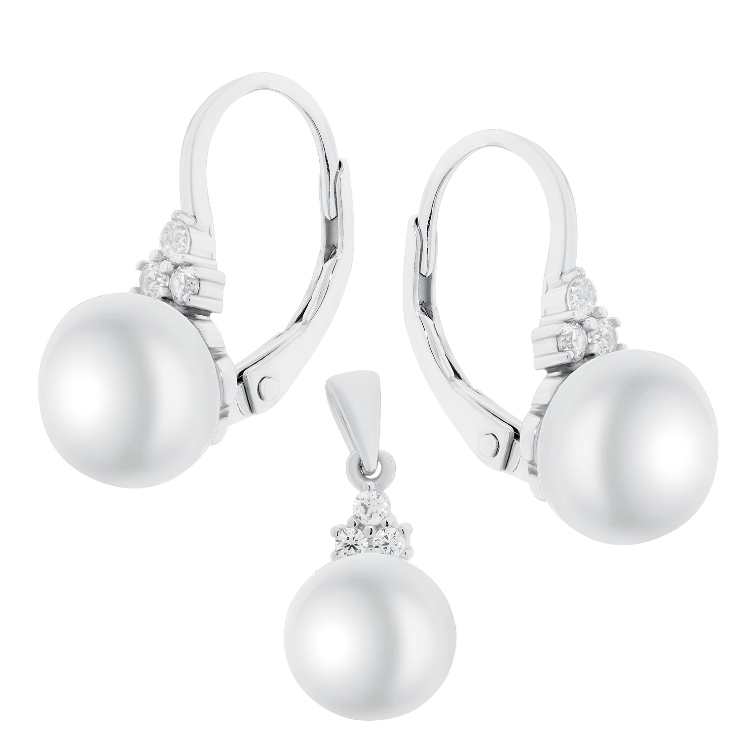 Dieses Schmuckset vereint die zeitlose Schönheit von Perlen mit dem edlen Glanz von 925 Sterling Silber. Die Ohrringe und der passende Anhänger sind mit großen, runden Perlen verziert, die durch ihre zarte, schimmernde Oberfläche sofort ins Auge fallen. Darüber funkeln kleine Zirkonia-Steine, die den luxuriösen Charakter des Sets unterstreichen.Dank der harmonischen Kombination von Schlichtheit und Glanz eignet sich dieses Set perfekt für den Alltag, ebenso wie für festliche Anlässe, Hochzeiten oder besondere Momente. Der Anhänger kann mit einer feinen Silberkette kombiniert werden und bildet mit den Ohrringen ein stimmiges Ensemble.