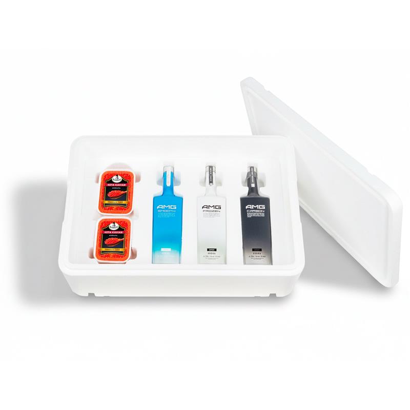Vodka SET "Präsident": Premium Vodka AMG in drei Geschmacksrichtungen und zwei Dosen Premium Gold Ketakaviar (Wildlachs, tiefgekühlt) von BARIN