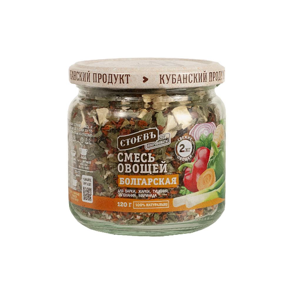 Die getrocknete Gemüsemischung „Bulgarische Art“ von Stoev ist eine vollmundige, aromatische Basis für deftige Hausmannskost. Sie besteht aus Paprika, Karotten, Zwiebeln, Pastinaken, Kräutern und Gewürzen – alle Zutaten schonend getrocknet, ohne Salz, ohne Zusatzstoffe, ohne Gentechnik.Die 130 g im Glas entsprechen etwa 2 kg frischem Gemüse – ideal für den Vorratsschrank. Einfach ins kochende Wasser, in Eintöpfe oder Pfannengerichte geben – das Gemüse entfaltet beim Kochen sofort seinen Geschmack und seine natürliche Textur.