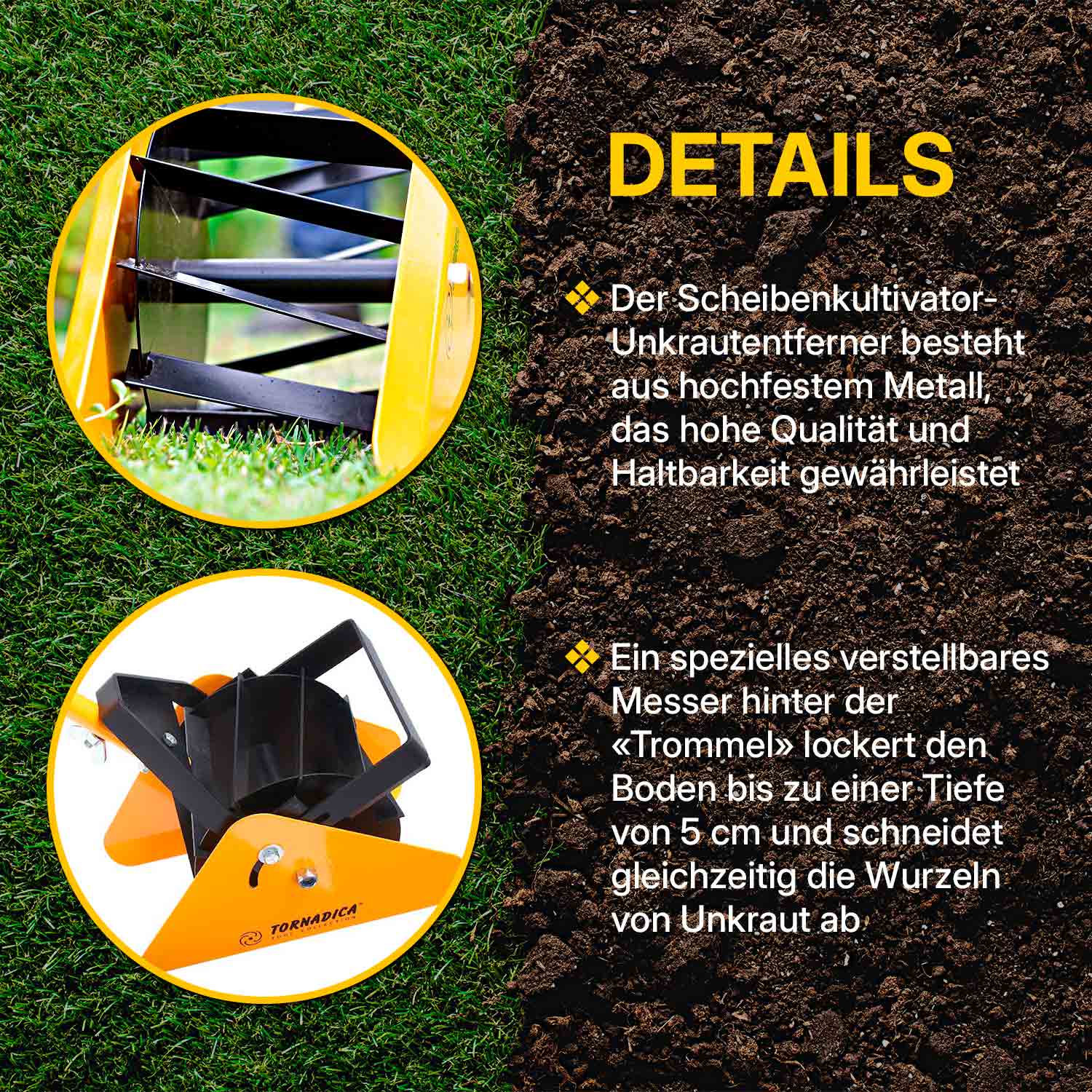 Eine verkleinerte Version des innovativen Kultivators Culti-Weeder Tornadica. Um mit dem Handkultivator den Boden aufzulockern und bei Unkräutern die Wurzel zu entfernen, bewegen Sie die Fräse einfach über den zu bearbeitenden Bereich. Die mit scharfen Messern versehene Trommel bewegt sich, indem Sie die Erdkralle vor sich herschieben. Gleichzeitig können Sie den Winkel des Kultivators einstellen, damit auch seitliche und schräge Arbeiten (z. B. in Gräben) möglich sind. Durch die Bewegung der Trommel lassen sich Unkräuter entfernen und der Boden lockern.TORNADICA Kultivator kaufen und Gartenarbeit erleichtern