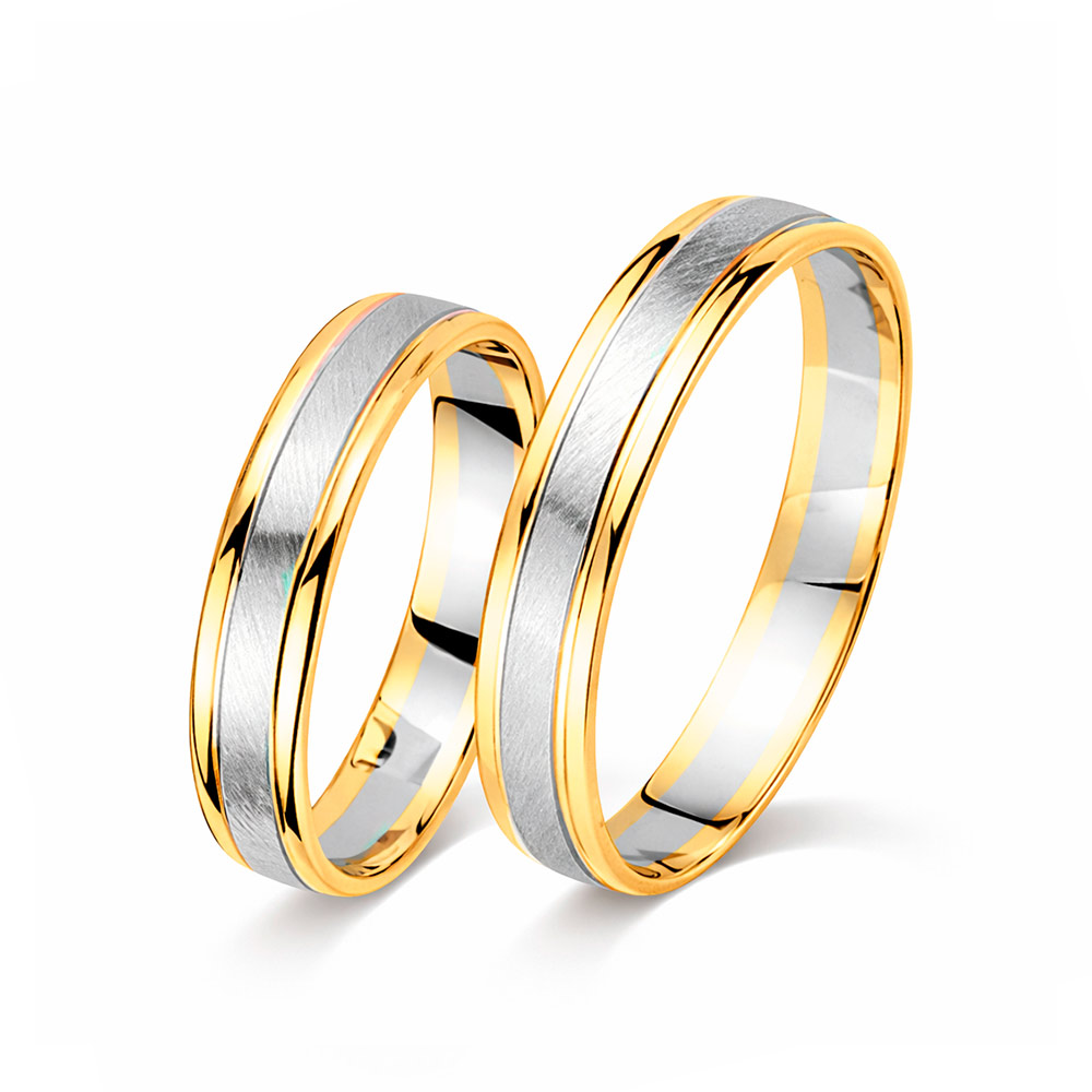 Trauringe aus 585er Gelb- und Weißgold, mit glänzender und matter Oberfläche, Breite ≈ 4,0 mm