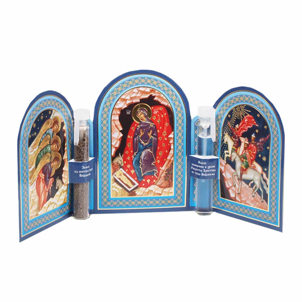 Triptychon-Ikone "Rozhdestwo Hristowo" mit Heiliger Erde und geweihtem Öl