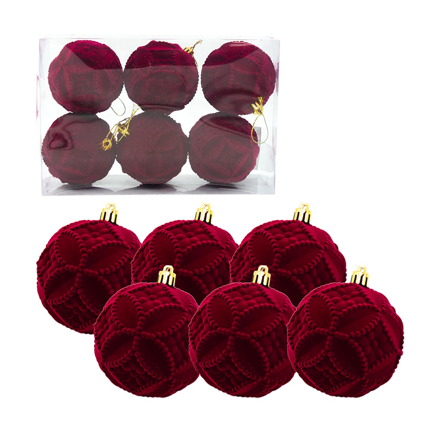 Weihnachtskugeln in sattem Rot mit geometrischem Design sind ein moderner und stilvoller Akzent für Ihre Festdekoration.Sechs Kunststoffkugeln mit einem Durchmesser von 8 cm eignen sich perfekt für den Weihnachtsbaum im Stil des festlichen Barocks, des skandinavischen Minimalismus oder des sowjetischen Retros.