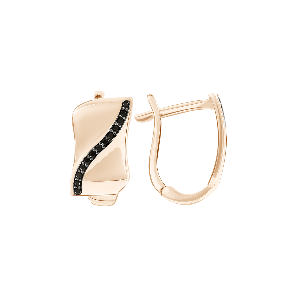 Moderne Ohrhänger aus russischem Rotgold 585, verziert mit schwarzen Zirkonia in sanft geschwungener Linie.Das Spiel aus warmem Gold und dunklem Glanz verleiht dem Schmuckstück eine Aura zeitloser Raffinesse.