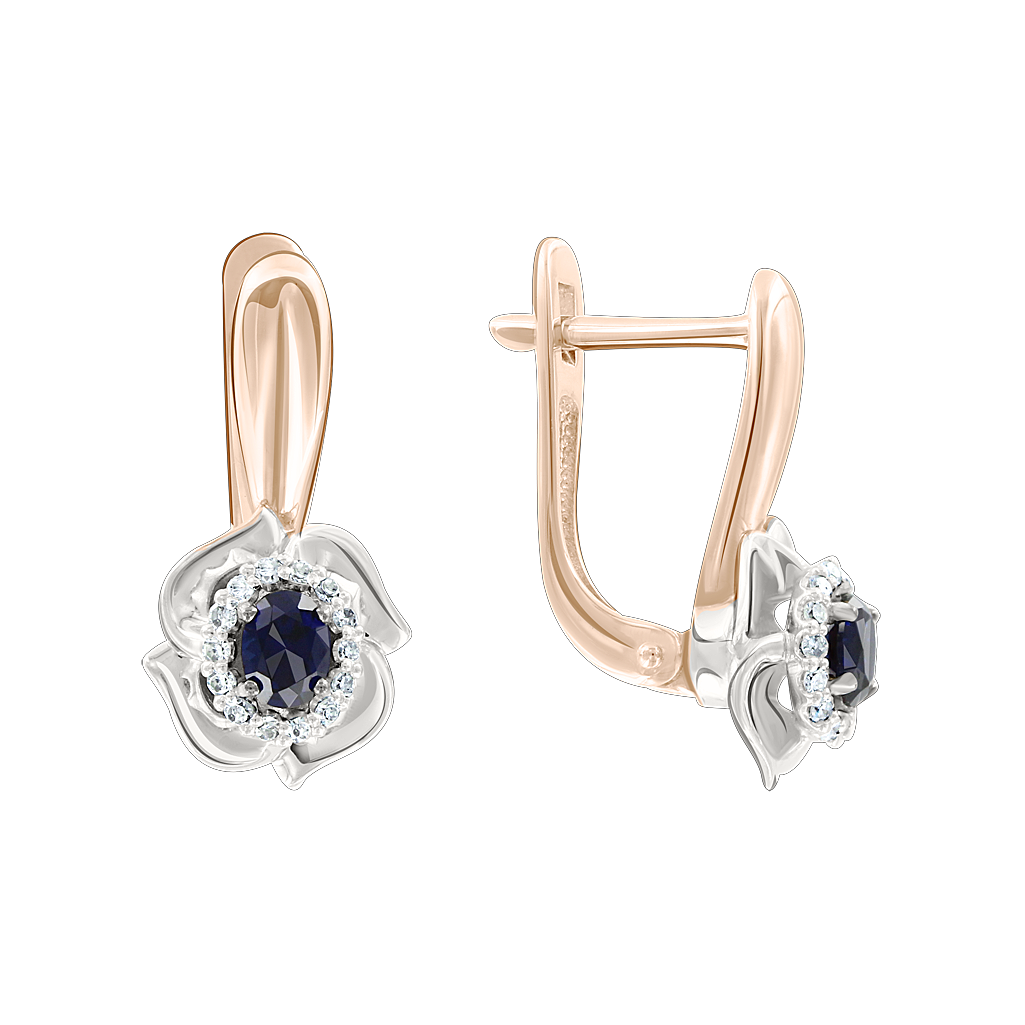 Prächtige Ohrringe aus russischem Rotgold 585, mit Einsätzen aus je 1 hydrothermalen Saphir - Größe ≈ 4x3 mm, und 14 Diamanten - Gewicht 0,131 ct. HSI, englisches Schloss, Höhe ≈ 18 mm