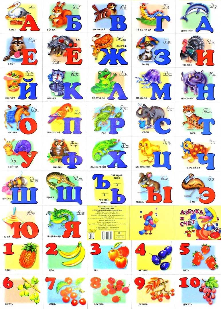 Colorful alphabet for preschoolers and primary school children. Cut the poster into individual cards with letters and numbers and the learning process can be turned into a fascinating game.- ISBN: 978-5-9780-0174-7