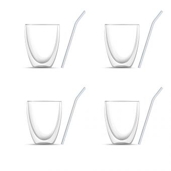 Set of 8: Four double-walled cappuccino glasses (without handle, 330 ml each) & four reusable borosilicate glass straws FREE.