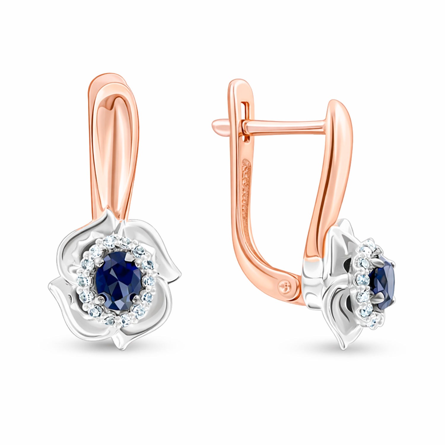 Magnificent earrings in Russian rose gold 585, each with inserts of 1 hydrothermal sapphire - size ≈ 4x3 mm, and 14 diamonds - weight 0.131 ct. HSI, English lock, height ≈ 18 mm