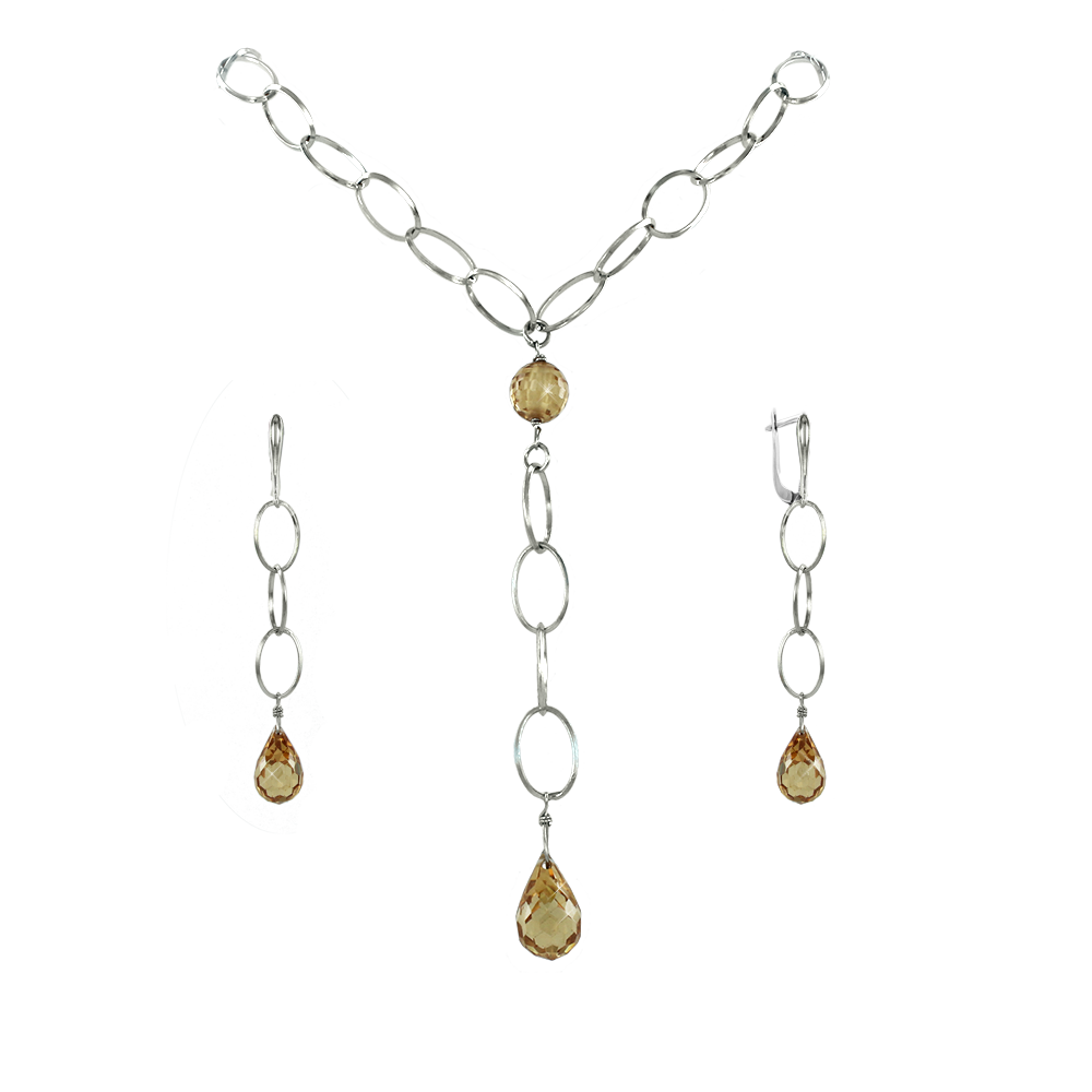 The jewelry pieces have large and thin elongated links in anchor braid. They are decorated with yellow stones. The interesting stone embellishment gives the earrings and necklace a sophisticated and attractive look. The light shape and fine lines do not overload the look and make the rather large accessories refined and elegant. These pieces of jewelry are beautiful in their simplicity and can easily be worn with any everyday look.Wear these earrings on their own or together with a necklace in the same design and make your look unforgettable!