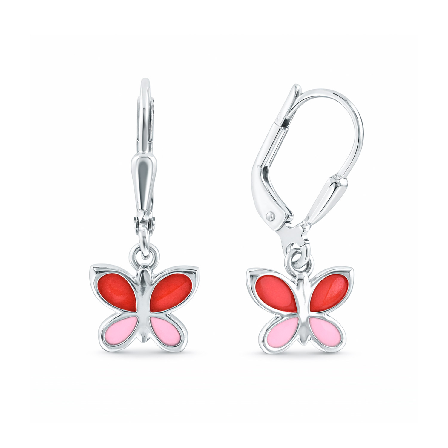 Cute butterfly earrings for children made of sterling silver, with pink and red enamel, leverback, height ≈ 23 mm.