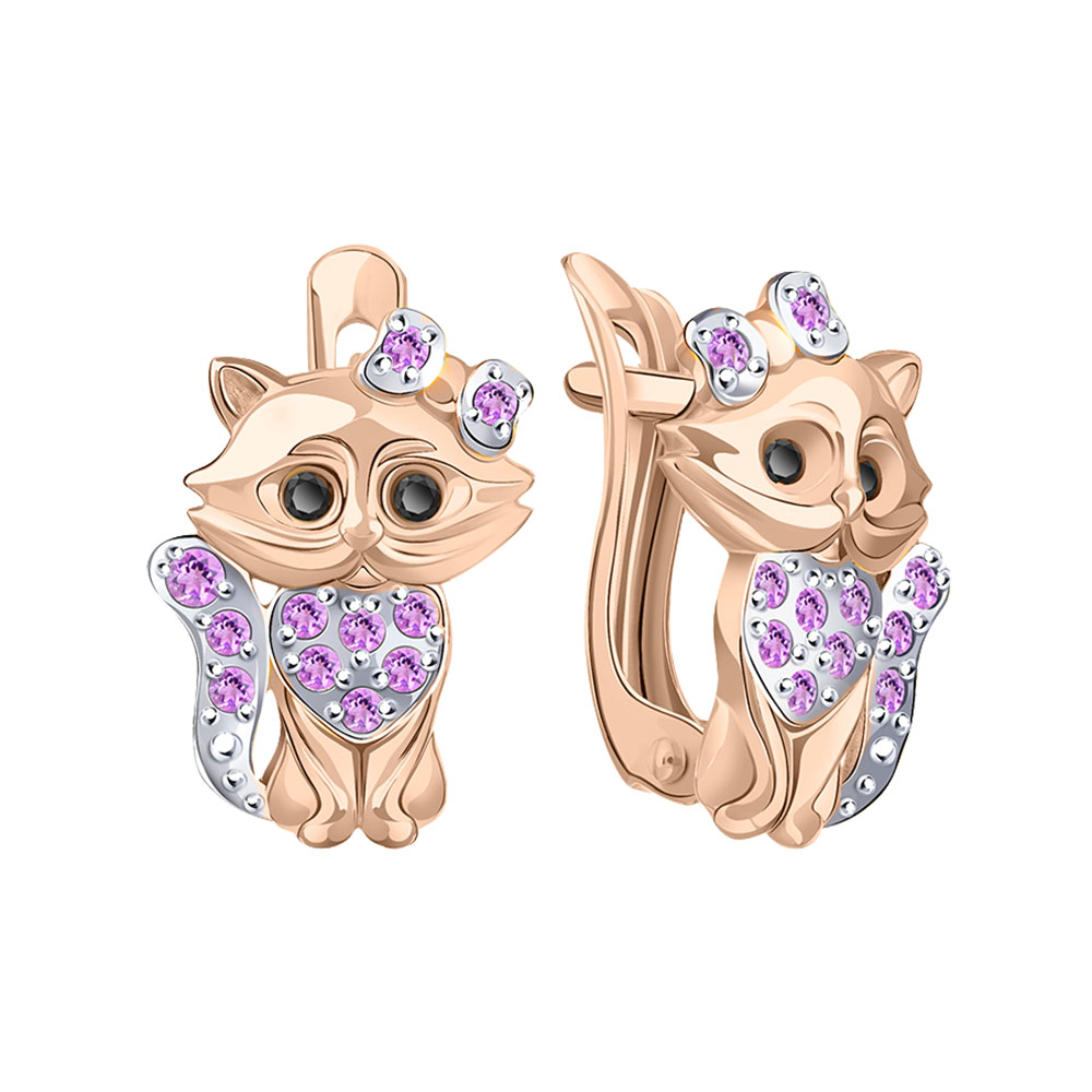 Children's earrings cat in 585 rose gold with black and pink zirconia
