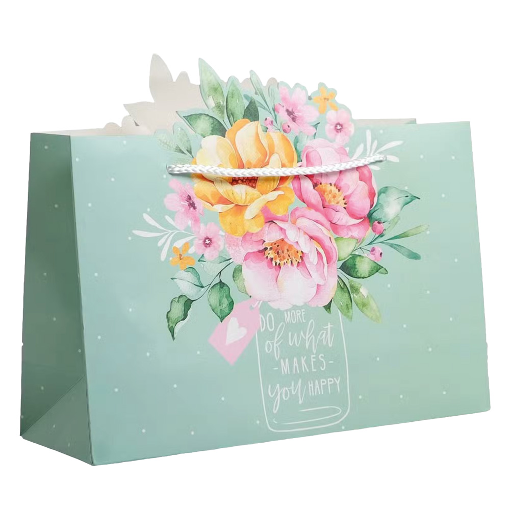 The "Do more..." gift bag features a fresh, modern design in soft mint tones and a delicate watercolor floral motif. The lovingly designed print conveys a positive message and makes the bag a special packaging for personal gifts.The decorative lettering on the front reads: "Do more of what makes you happy"