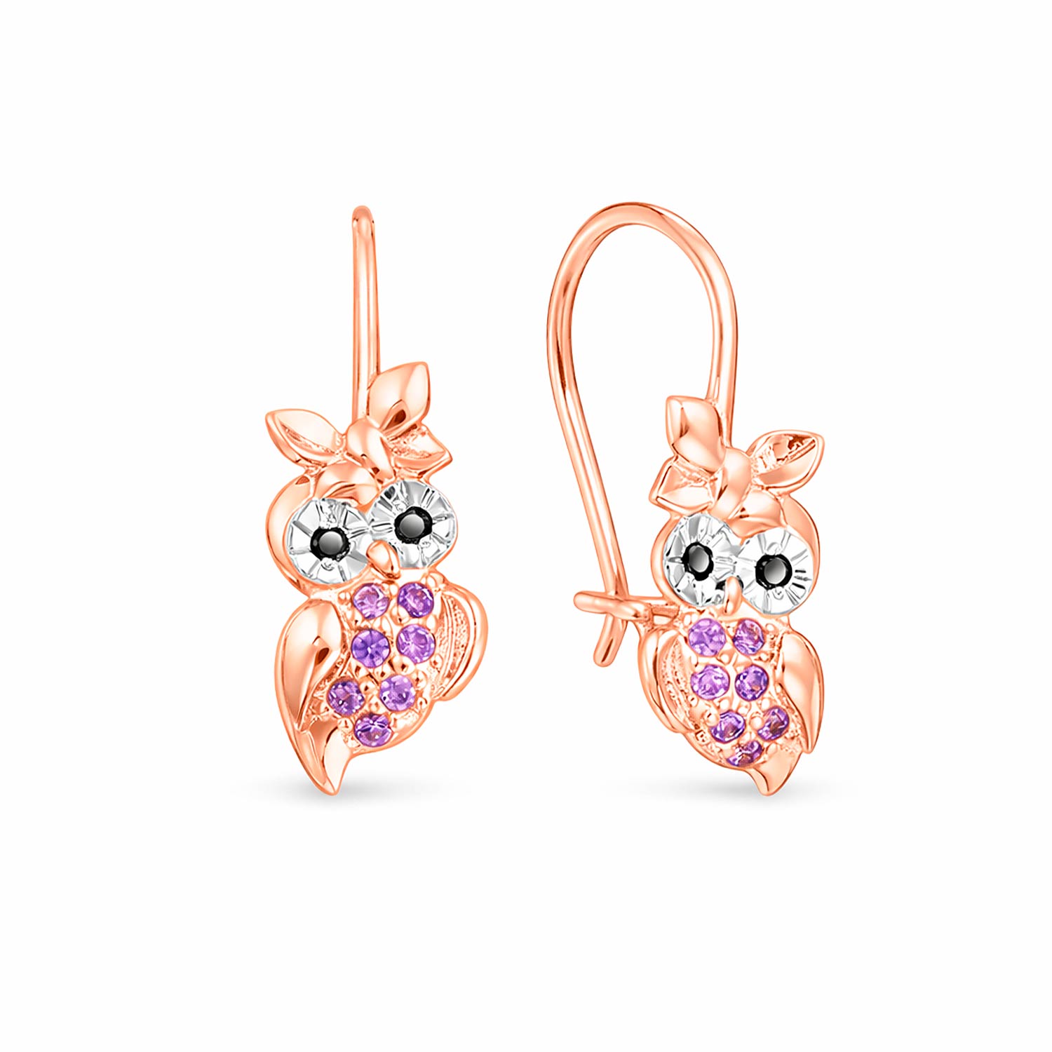Beautiful children's earrings in 585 rose gold, in the shape of an owl, with zirconia, height ≈ 17 mm.