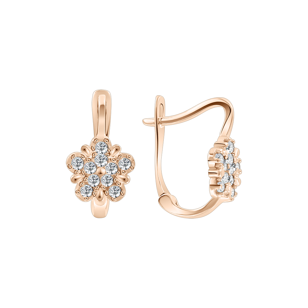 Exquisite flower-shaped earrings in 585 rose gold, with zirconia inserts, height ≈ 14 mm.