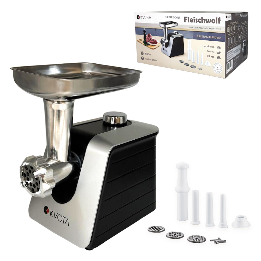 The KVOTA 3-in-1 electric meat grinder is a powerful and versatile kitchen appliance that offers you maximum freedom when preparing meat dishes. With an output of up to 1500 watts, it processes meat quickly and reliably - from fine minced meat to coarse textures for homemade specialties.Thanks to the extensive set of accessories, the appliance is not only suitable for mincing, but also perfect for making sausages and kebbe. The three metal discs allow different degrees of grinding, while the sausage attachments open up a wide range of preparation options.