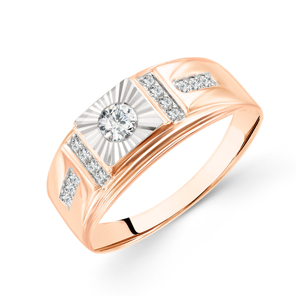 Spectacular men's ring in 585 Russian red gold, rhodium-plated, with a diamond facet and 13 fianites, front width ≈ 8 mm.