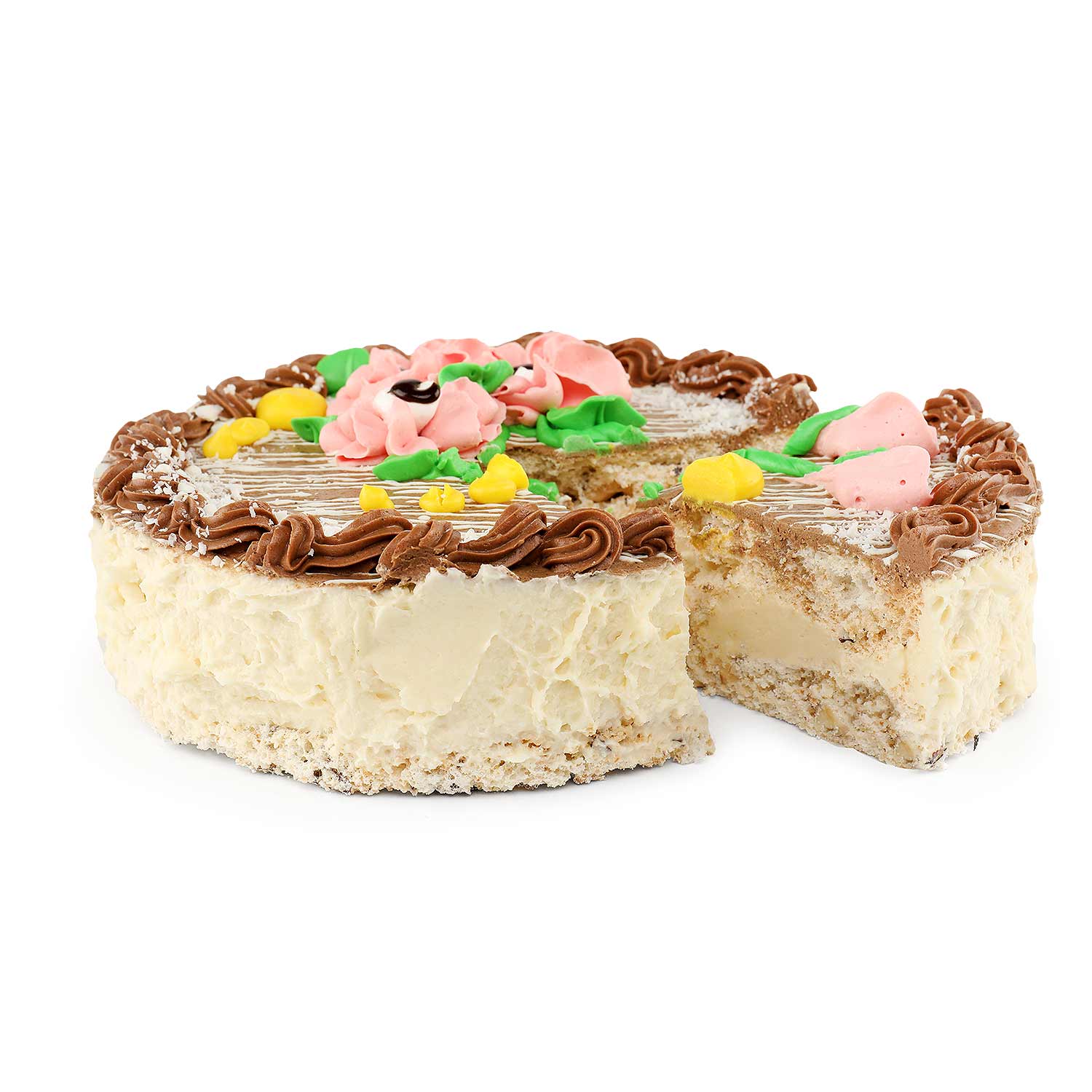 A touch of nostalgia and pure indulgence - the legendary Fili Baker Torte Kievskiy brings a piece of classic confectionery art to the table.This traditionally made cake impresses with its fluffy meringue, roasted hazelnuts, fine buttercream made from sweetened condensed milk and delicate layers of cocoa sponge. Refined with great attention to detail, it not only delights with its taste, but also with its magnificent appearance - ideal for celebrations or special moments of indulgence.