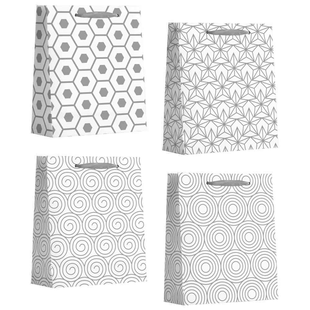 The gift bag set consists of 12 stylish bags that are ideal for wrapping gifts in an elegant and modern way. Each bag measures 26 x 32 x 10 cm and offers enough space for gifts of different sizes. The set includes four different graphic patterns - including hexagon, star, spiral and circle motifs - that have a sophisticated, monochrome look and exude timeless elegance.These high-quality gift bags are perfect for birthdays, Christmas, weddings and many other occasions. The sturdy handles make them easy to carry and show off any gift to its best advantage.