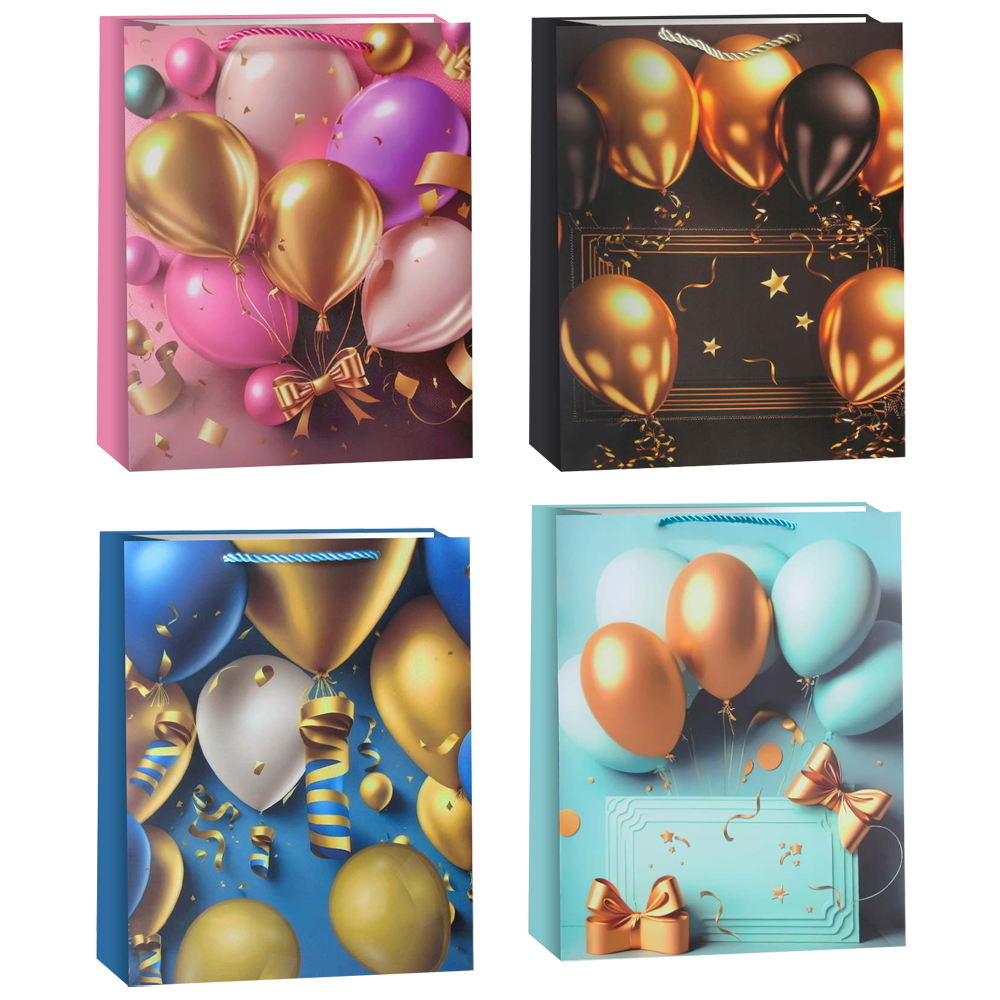 The elegant gift bag set with 12 pieces and a size of 31 x 40 x 12 cm is perfect for special occasions such as birthdays, anniversaries or celebrations. The bags are designed with stylish balloon motifs in shiny gold, black, pink and blue tones and exude a luxurious and festive atmosphere.Each bag is equipped with sturdy carrying handles for easy transportation. The robust material ensures that even heavier gifts can be packed securely. The high-quality prints and fine details such as bows and stars make these gift bags a real eye-catcher.
