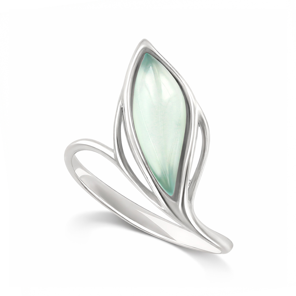 This elegant ladies' ring in 925 sterling silver seduces with its curved, nature-inspired shape and the soft shimmer of an aqua agate.The gemstone in delicate, translucent blue-green is reminiscent of the calm of the ocean and the clear light of a summer morning. The delicate, open setting emphasizes its natural beauty and lends the piece of jewelry an almost floating lightness.