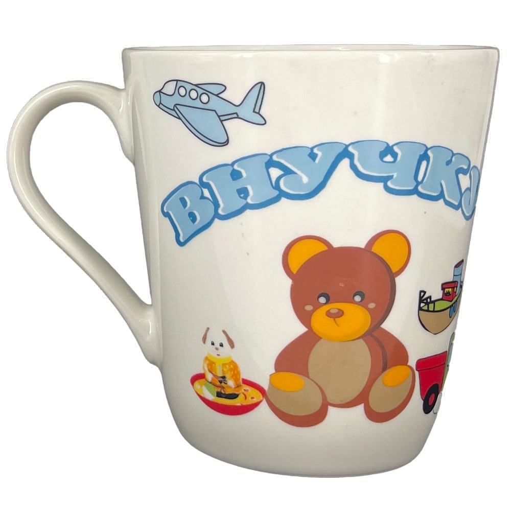 This mug is a charming and colorful gift for grandchildren. It is made of high-quality ceramic and has a capacity of 0.4 liters, making it ideal for hot and cold drinks. The design features a cute brown teddy bear, a small airplane and various child-friendly motifs such as toy cars and a puppy, which express joy and playfulness. The Russian lettering "Внучку" means "grandchild", which makes this mug a loving gift for the grandchild.The mug is robust and dishwasher-safe, which makes it not only decorative but also practical for everyday use. Thanks to the generous handle, it sits comfortably in the hand and offers optimum comfort when drinking. Ideal for children who want to enjoy drinking with cheerful colors and playful motifs.