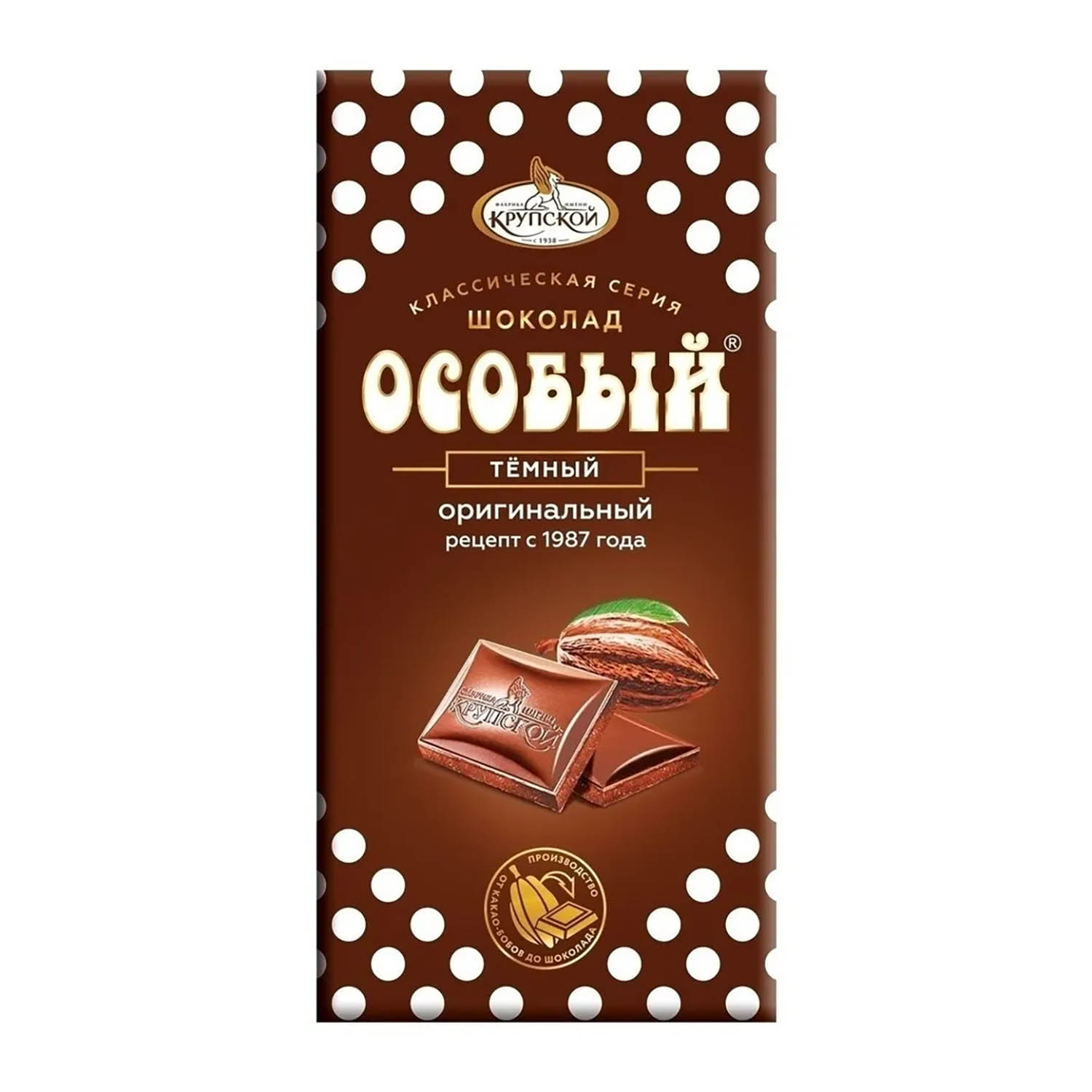 "Krupskoy" dark chocolate "Osobij" of the classic series - original recipe since 1987Discover the classic dark chocolate from the famous Krupskoy factory - made according to the original recipe from 1987 and in compliance with GOST 31721. This finely balanced creation impresses with its intense cocoa flavor and creamy texture.