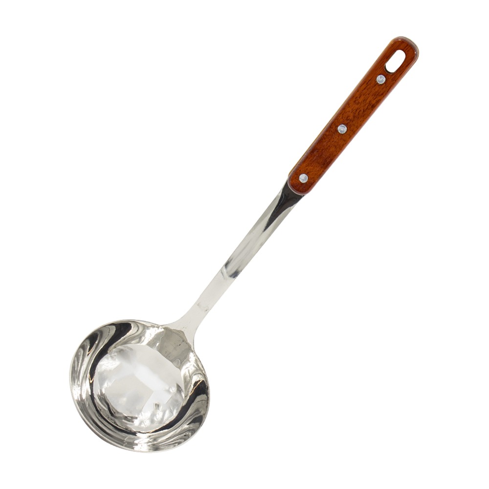 Large ladle made of thick, durable stainless steel with a comfortable, strong wooden handle (actually 2 wooden plates fixed with stainless steel rivets on a solid steel base) will perfectly complement your kettle both in terms of functionality and authentic design.At the end of the handle there is a hole for hanging. The large bowl is suitable for serving a large portion of food to your guests.