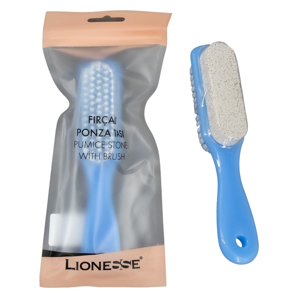 The Lionesse pumice stone with brush and handle is a practical and effective care tool for removing rough skin from the feet. Measuring 17 x 3.5 x 3.5 cm, it has a comfortable handle that makes it easier to handle and therefore enables targeted application. The pumice stone gently cleanses the skin of dead cells and at the same time prevents the development of athlete's foot. Made from naturally occurring volcanic rock, it contributes to healthy skin and its porous structure ensures hygienic conditions as it does not absorb water.Features:
