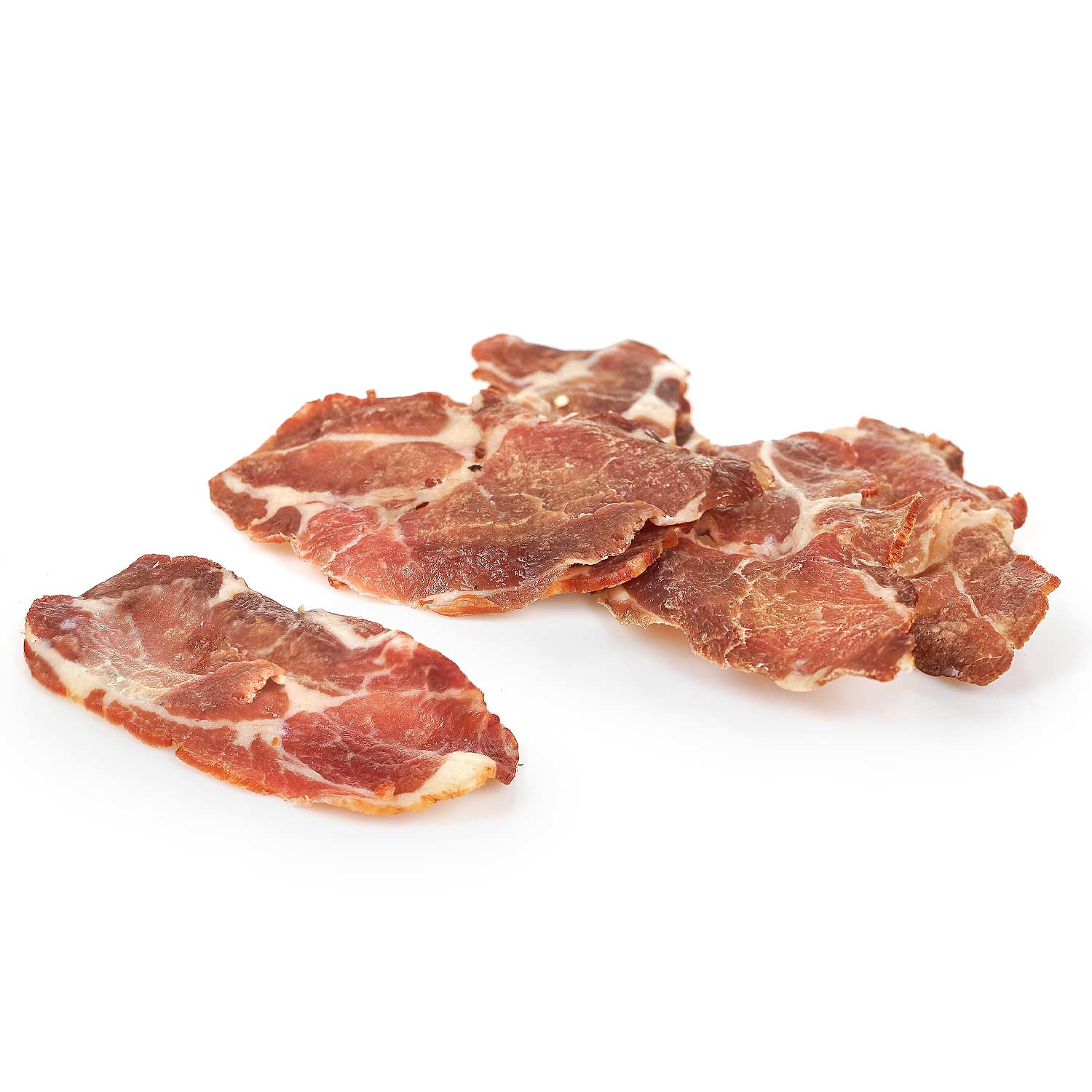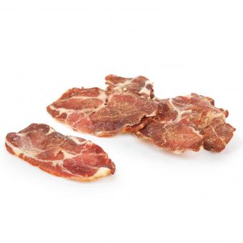 Family Farm Meat Chips made from smoked pork neck, 65 g are a unique meat snack that will delight you with its intense aroma and spicy taste.Thanks to the gentle smoking process over wood, the Meat Chips develop an authentic, smoky note that harmonizes perfectly with the spicy blend of spices. The crispy consistency makes them the perfect snack for between meals, on the go or as a hearty accompaniment to a cold beer.