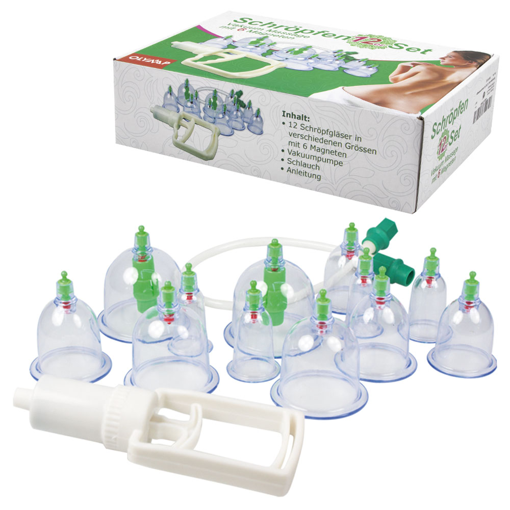Olympus cupping glasses - set of 12 for vacuum massage, with 6 magnets.