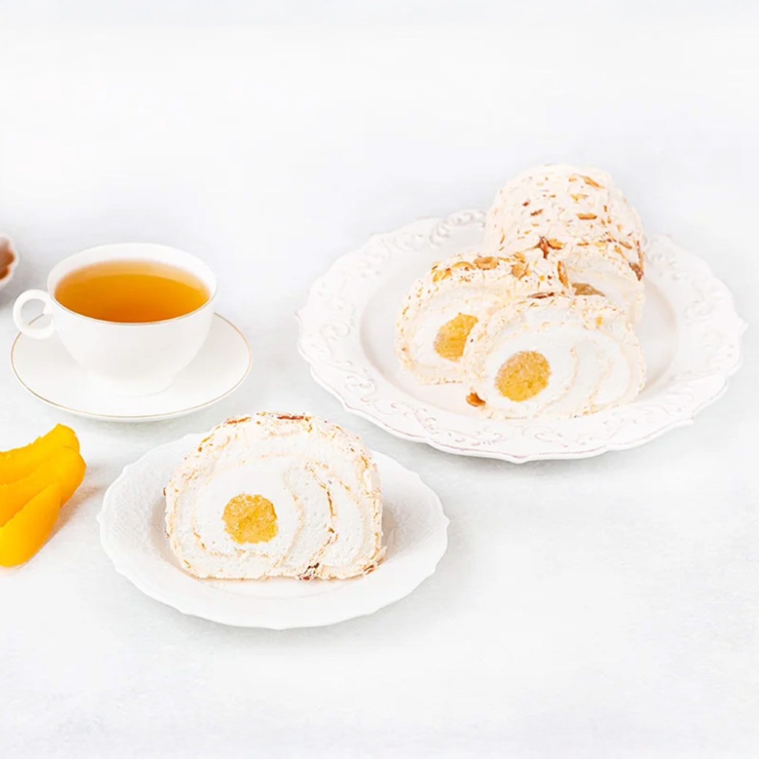 The Palych meringue roll with peach is a legendary, gluten-free dessert that delights with its unique combination of delicate, soft meringue and airy peach mousse. Filled with natural condensed milk and juicy, sun-ripened peaches, this exquisite dessert offers an incomparable taste experience. Perfect for gourmets and lovers of exceptional desserts.Properties: