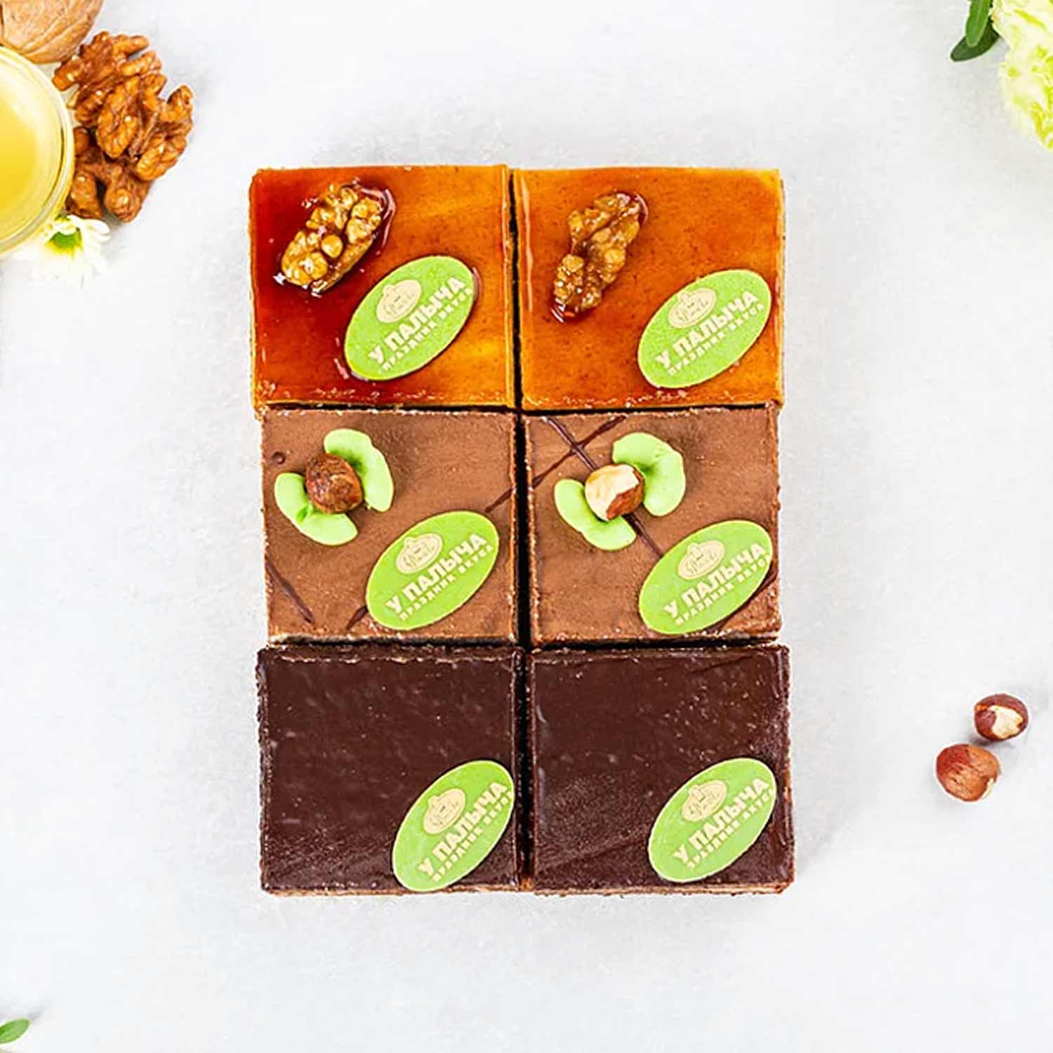 All popular bestsellers - in the original, stylish presentation of 6 miniature cakes. It's so convenient to buy three bestsellers in one pack!- Kievsky - large hazelnuts, fluffy hazelnut crust and creamy chocolate pudding "Charlotte", real dark chocolate. The cake is made according to the classic recipe using only selected hazelnuts with no added peanuts.