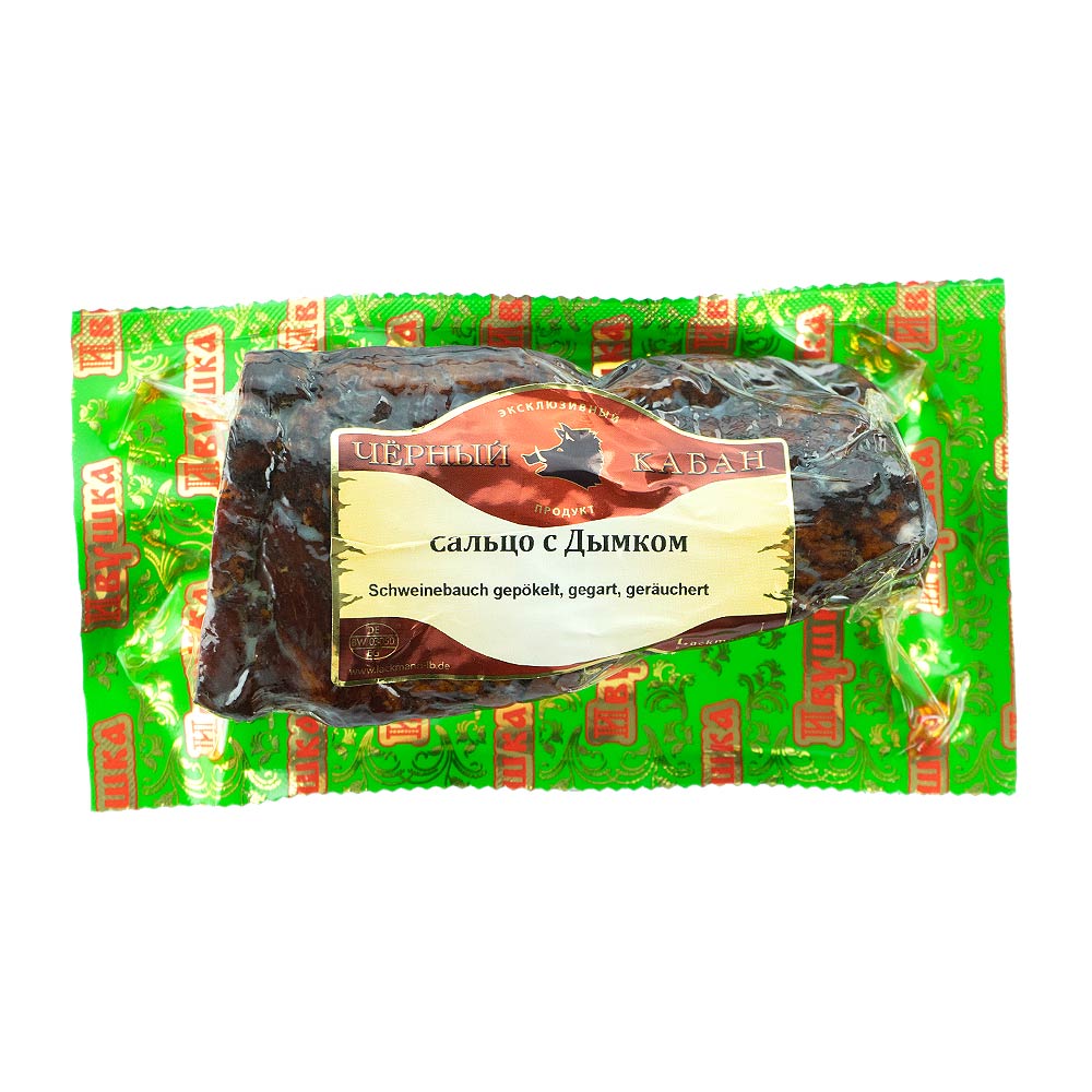 A strong, rustic delicacy for lovers of intense smoked flavors!The exclusive black-smoked pork belly "Tschjornyj Kaban" is carefully cured, gently cooked and then refined over particularly dense, dark smoke. The result is an exceptionally aromatic speciality with a deep, almost caramelized smoky flavour and an unmistakably dark exterior.
