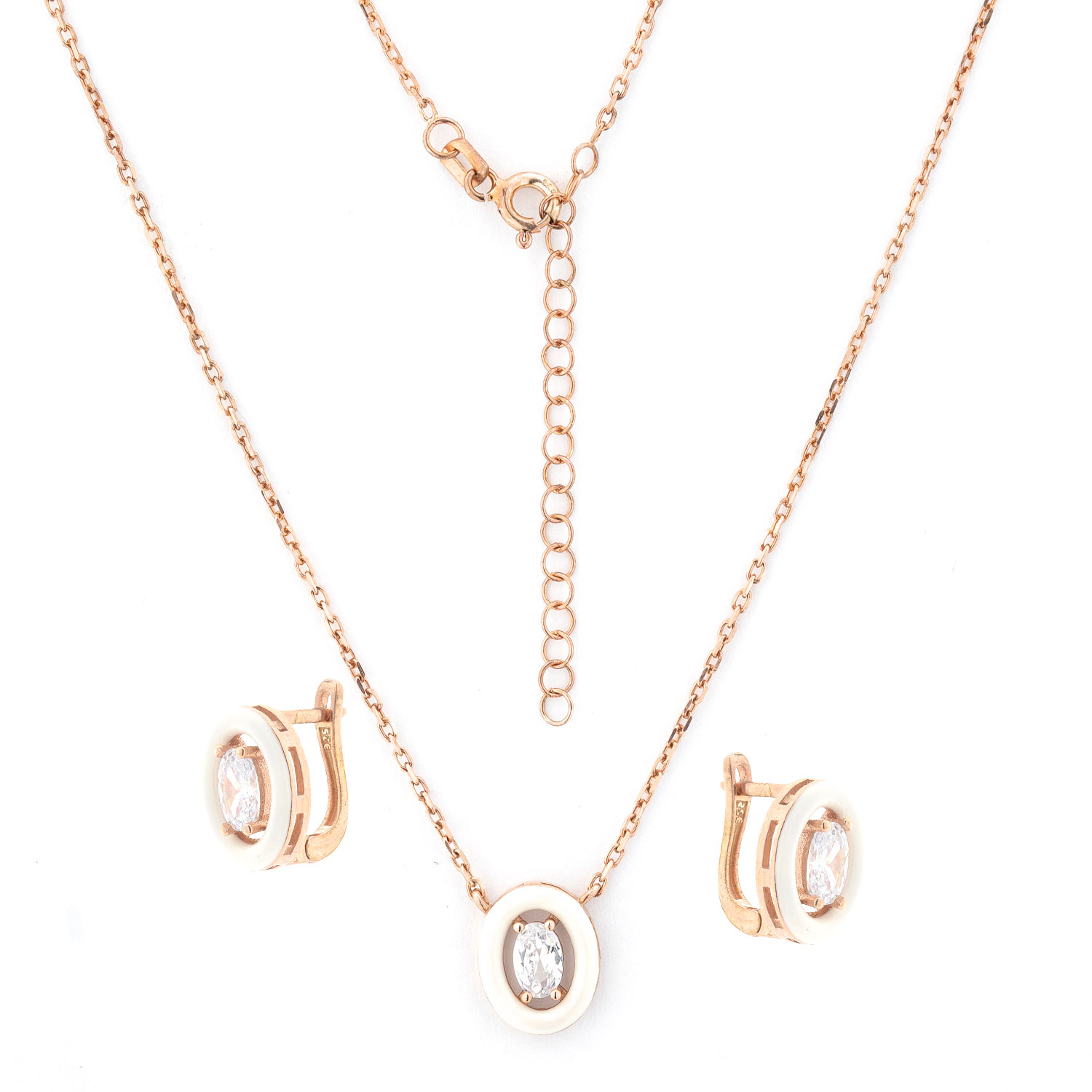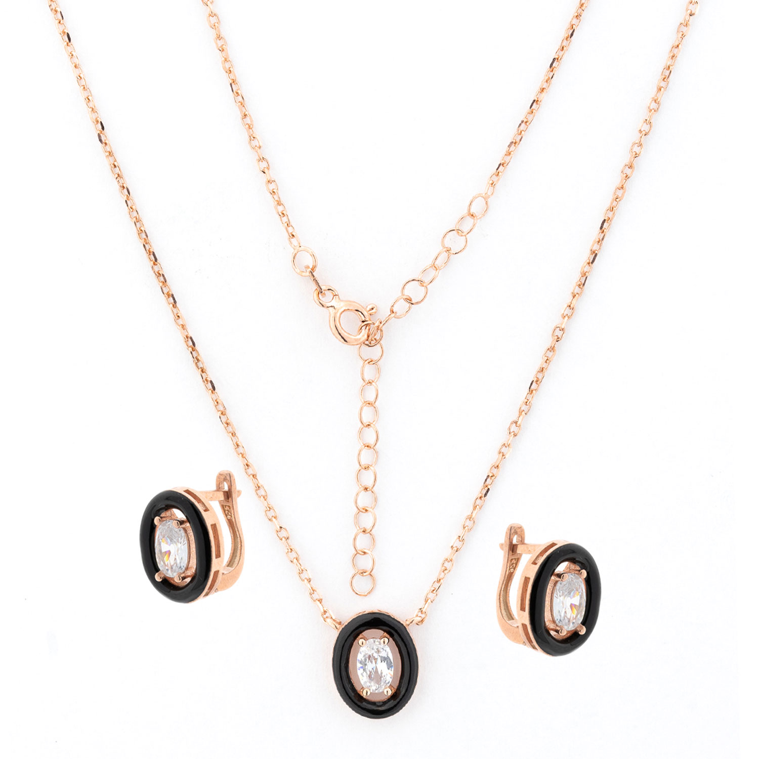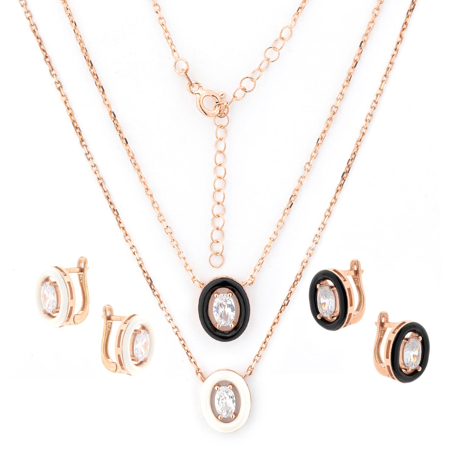 Set: Earrings + necklace in 925 silver, gold-plated, with zirconia, framed in white or black enamel