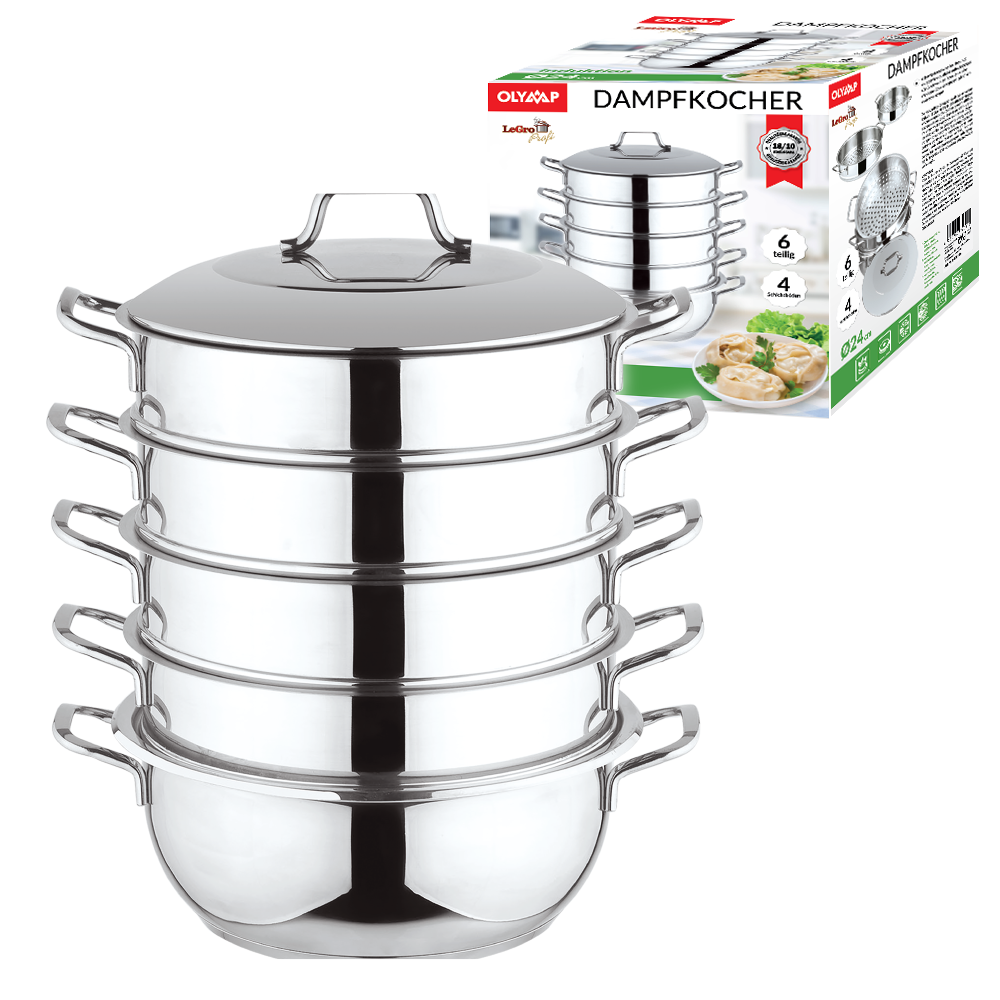 A stainless steel steamer that is not only suitable for preparing manti, but up to four other dishes at the same time. The steamer can be used as a normal cooking pot and is suitable for all types of stoves.Features: