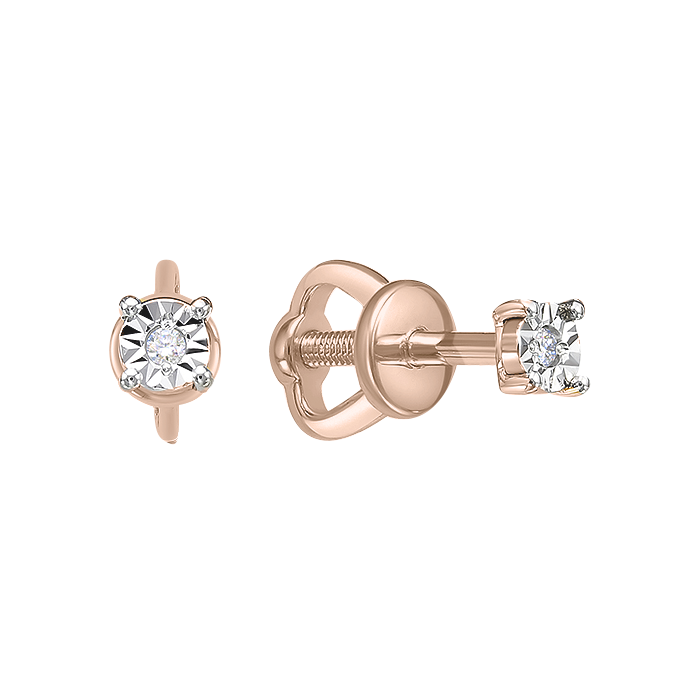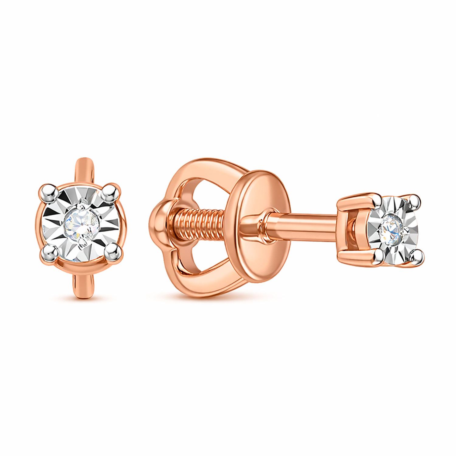 Exquisite stud earrings in 585 red and white gold, each with inserts of 1 brilliant-cut diamond - weight 0.019 ct. HSI, diameter ≈ 3 mm.