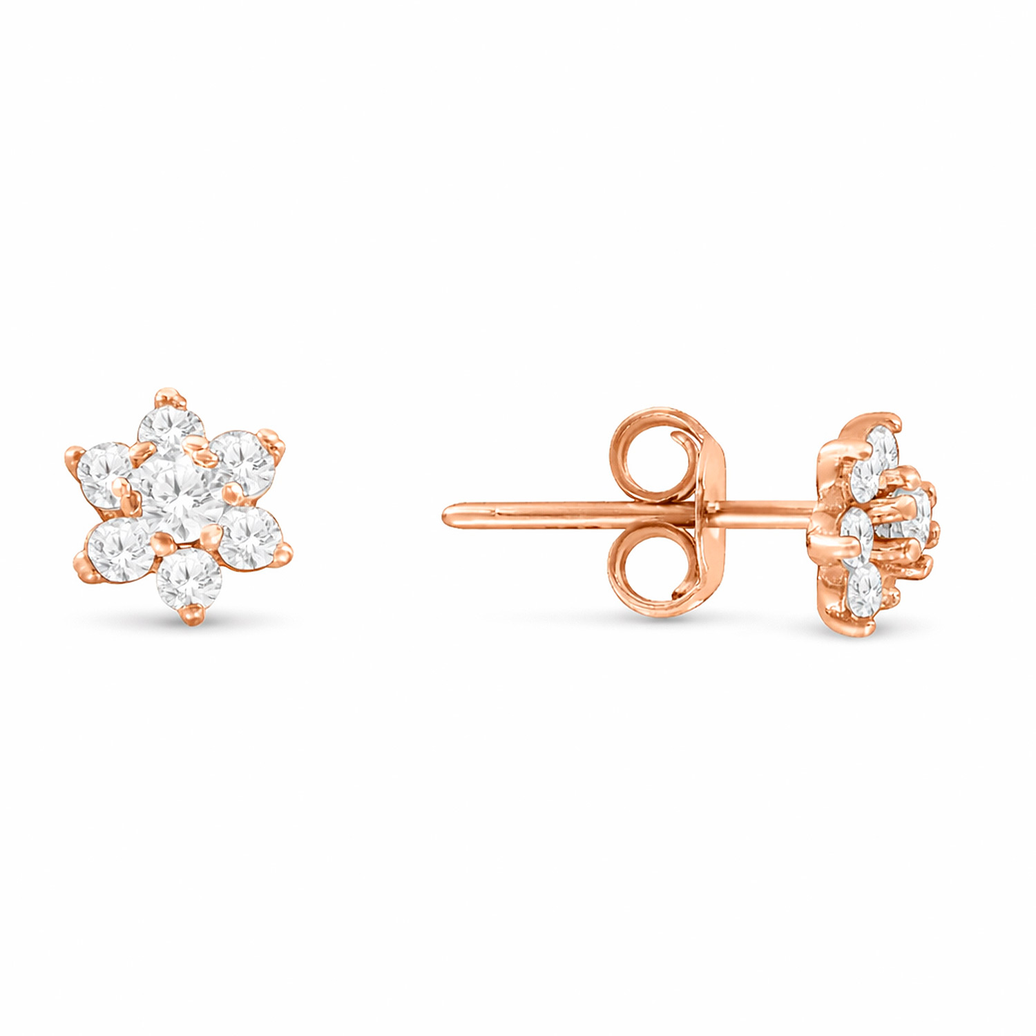 Elegant stud earrings in 585 rose gold, with zirconia, diameter ≈ 6 mm.
