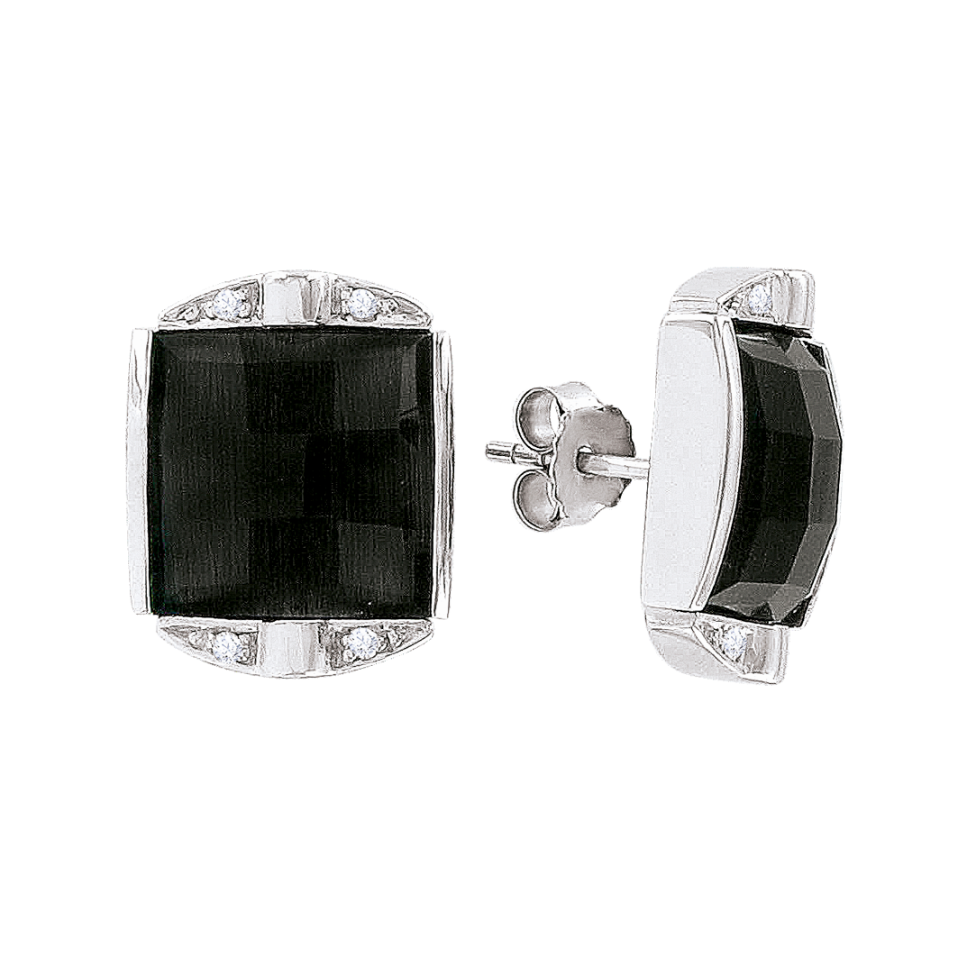 Unique stud earrings made of 925 sterling silver, featuring black cat’s eye stones and four sparkling cubic zirconia on each – height approx. 16 mm