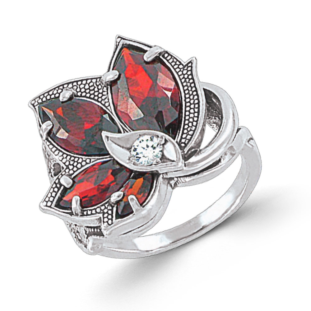 This ring captivates with its radiant individuality, extravagance and uniqueness. The spectacular inlay of bright red marquise-cut crystals and round-cut flower-shaped zirconia softens the look and emphasizes your individuality. Rings with a floral design like this one enchant with their grace, playfulness and femininity. The ring plays with contrasts, combines passion and tenderness, has a unique charm and looks incredibly attractive.Most often, such cocktail rings are worn on the middle or index finger and are combined with both evening dresses and casual wardrobe.
