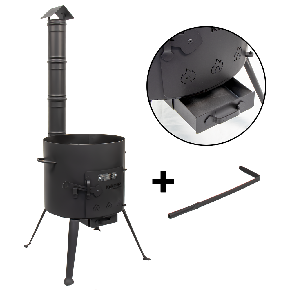 Учаг с разборной дымоходной трубой предназначен для безопасного и быстрого приготовления пищи на открытом воздухе в казане, походном котле с максимальным комфортом. Изделие представляет собой металлический цилиндр-корпус, в комплект которого входят съёмные ножки, дверца, зольный ящик, кочерга, 3-х секционная труба. За счёт оптимальной толщины стенок (2 мм) исключена возможность деформации стенок изделия. Оснащение учага дымоходной трубой обеспечивает комфорт при эксплуатации. Дым у данного учага выходит в трубу, при этом не попадает в глаза, не дымит на одежду. В случае необходимости транспортировки дымоходную трубу можно отсоединить. Термостойкое покрытие препятствует образованию ржавчины и предохраняет от нагара. .