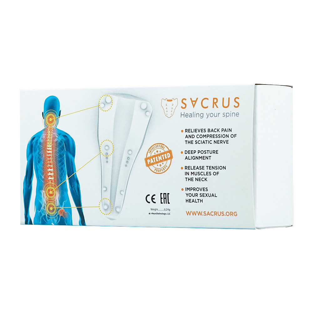 Sacrus — это базовый механический аппарат для глубокой разгрузки зоны крестца, диафрагмы и черепа. Снимает боль и напряжение, расслабляет связки и глубокие околопозвоночные мышцы (которые находятся на глубине до 30 мм), а также улучшает кровоток в органах малого таза и позвоночнике.Принцип действия: