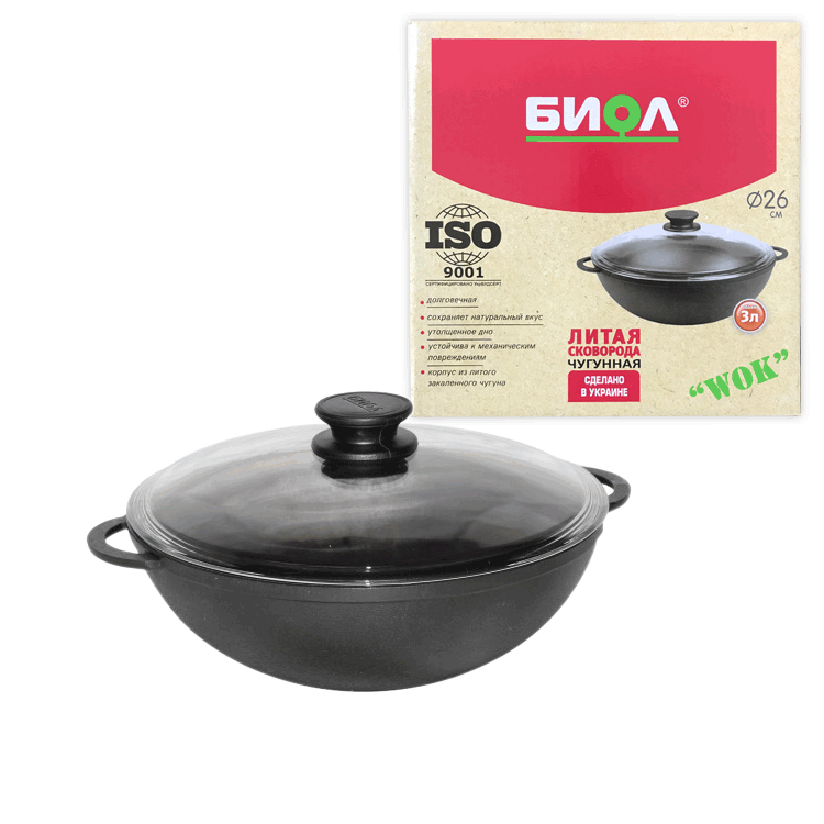 - БИОЛ Сковорода ВОК, чугунная со стеклянной крышкой, диаметр Ø 26 см